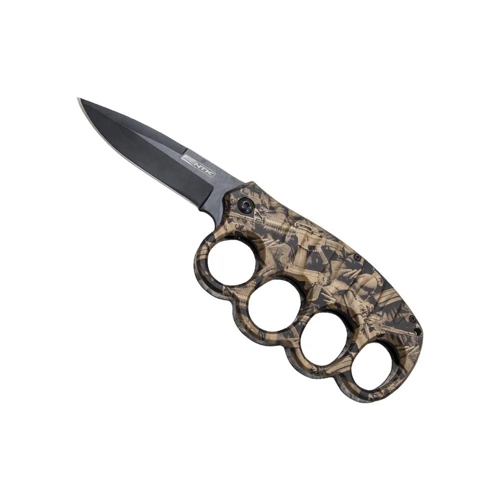 Canivete com empunhadura tipo "soco-inglês", de porte médio com lâmina em aço inoxidável. Abertura semiautomática, com pino que permite abrir com o dedo facilmente.
